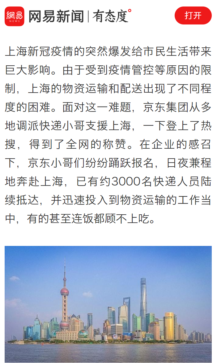 上海新冠疫情的突然爆发给市民生活带来巨大影响。由于受到疫情管控等原因的限制,上海的物资运输和配送出现了不同程度的困难。面对这一难题,京东集团从多地调派快递小哥支援上海,一下登上了热搜,得到了全网的称赞。在企业的感召下,京东小哥们纷纷踊跃报名,日夜兼程地奔赴上海,已有约3000名快递人员陆续抵达,并迅速投入到物资运输的工作当中,有的甚至连饭都顾不上吃。
