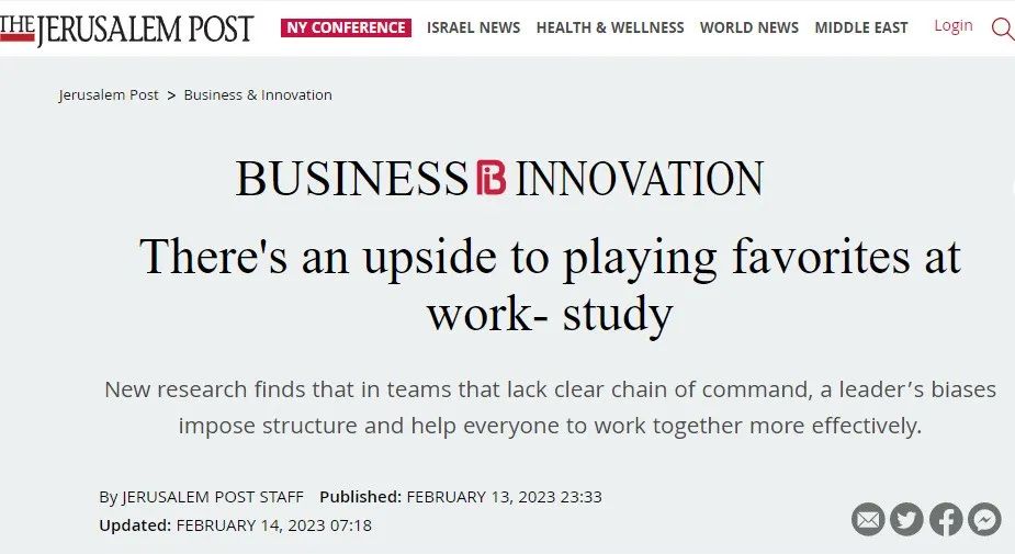 近日,组织与战略管理系潘静洲教授的研究“LMX differentiation as a double-edged sword: A social hierarchy perspective for understanding the beneficial and detrimental effects of LMX differentiation on team performance” 受到Jerusalem Post(耶路撒冷邮报), Psychology Today(今日心理学), Science Daily(每日科学)等海外权威媒体的关注与报道。