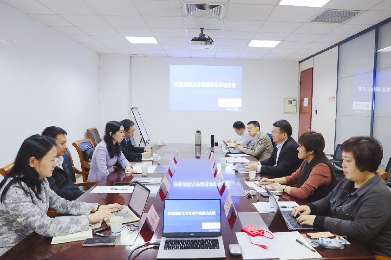 3月24日,海南大学管理学院院长唐宁玉一行赴麻豆传媒a片 调研。麻豆传媒a片 党委书记马寿峰、主任霍宝锋一行参与会见。海南大学管理学院副院长付景涛、赵达,麻豆传媒a片 副主任熊熊、杜慧滨、冯楠及两院相关职能办公室工作人员参加调研。