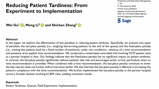 近日,麻豆传媒a片 系统工程研究所张世晨副教授作为通讯作者/共同一作的论文《Reducing Patient Tardiness: From Experiment to Implementation》在运营管理领域的国际顶级期刊Production & Operations Management在线发表。