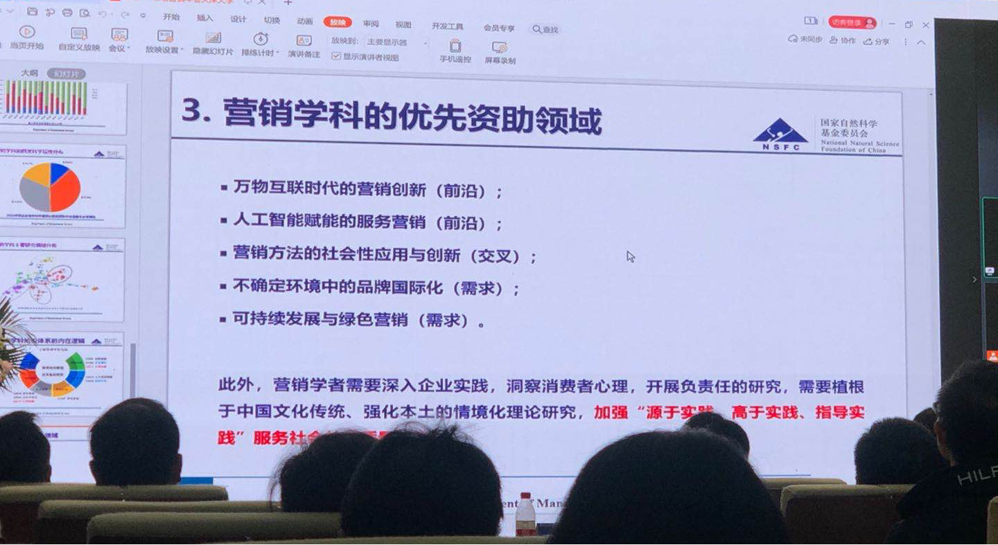 国家自然科学基金委管理科学部处长吴刚在线上致辞中对市场营销学科发展现状进行了详细分析,并指出,市场营销领域历年资助率高于工商其他领域。他分享了营销学科主要研究领域分布以及工商管理学科知识体系的内在逻辑,并结合“十四五”规划,介绍了营销学科的优先资助领域。他呼吁营销学者需要深入企业实践,洞察消费者心理,开展负责任的研究,需要植根于中国文化传统,强化本土的情境化理论研究,加强“源于实践、高于实践、指导实践”服务社会的高质量研究。