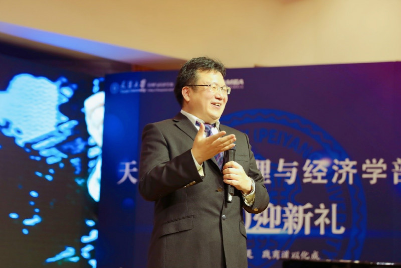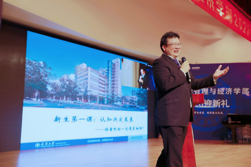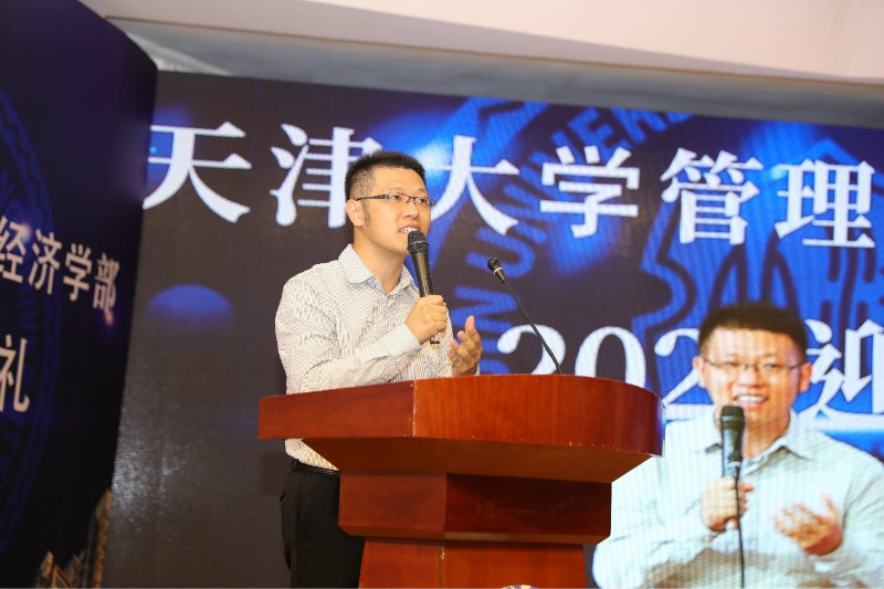 经管学部主任霍宝锋在致辞中表达了对全体新生的热烈欢迎。他结合自身经历,分享了自己与天大的点滴故事,并勉励同学们培养持续学习的能力,在日新月异的发展中勇立潮头,创造属于自己的未来。