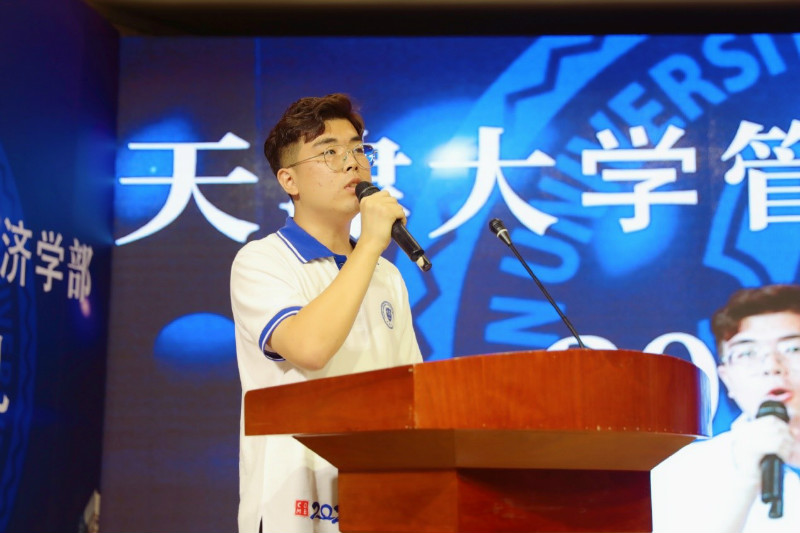 2020级公共管理专业田野代表硕士新生发言。他分享了自己加入天大经管大家庭的喜悦心情,并讲述了参与疫情防控的工作经历,他说,这段经历让自己磨练意志、锻造品格,更加深刻地体会到“做真学问、练真本领”的重要性,并呼吁同学们脚踏实地,方能仰望星空。田野表示,借助学校雄厚的师资力量和优质的学习资源,各位同学一定可以抓住更多机会,创造美好未来。