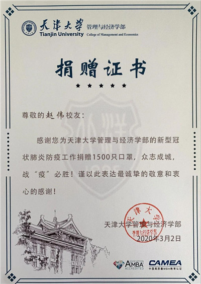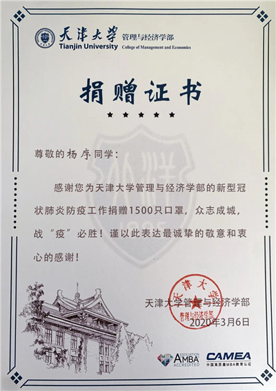 杨序说,“天大的校训就是‘实事求是’,只要学校需要,我随时做好捐赠更多批次物资的准备,以应对后期学生返校学部对口罩的更多需求。作为MBA班长,理应尽己所能,帮助学部师生在一个相对安全的环境里工作和学习。”
