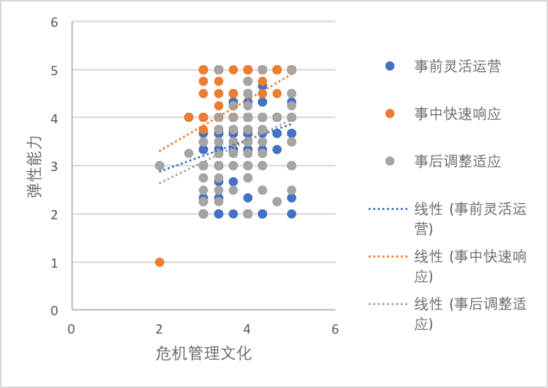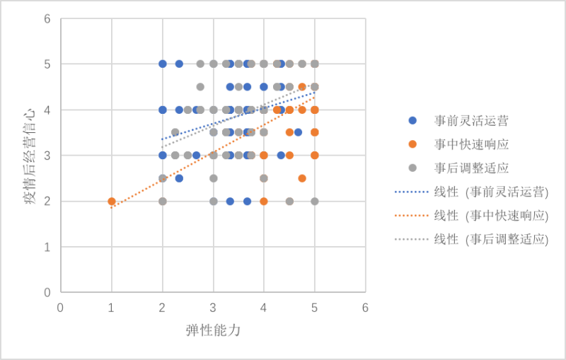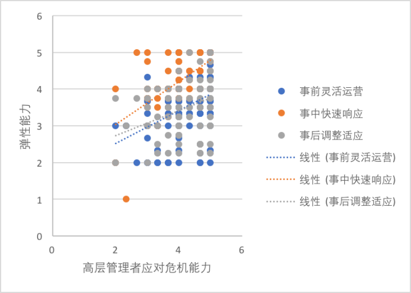 预期恢复时间、预期恢复成本以及疫情后经营信心是企业的三种应急管理绩效,我们关注企业弹性能力如何影响这三种绩效。验证数据后可以发现,事前灵活运营、事中快速响应和事后调整适应能力都和企业疫情后经营信心有显著的正相关关系。而在这三种弹性能力中,随着事中快速响应能力的提高,企业疫情后经营信心会有更大幅度的提升。