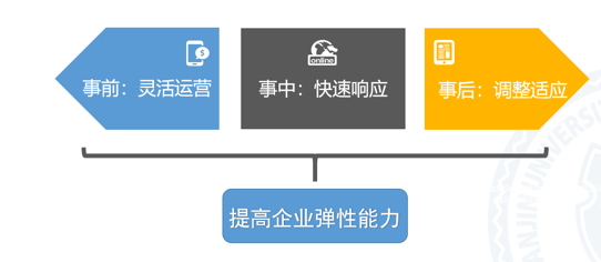 综上所述,企业的弹性能力对于企业在重大突发事件中快速恢复、降低损失有着重要作用,企业可以从事前灵活运营、事中快速响应和事后调整适应三个方面来提高弹性能力。事前灵活运营能力需要企业危机管理文化和高层管理者应付危机能力的保障,同时企业需要具备一定的资源储备,包括现金、原材料和产成品三个部分。事中快速响应表现为突发事件发生后,企业积极与供应商和客户进行沟通,并可以快速修订运营计划、组织资源来应对危机。事后调整适应能力在三种弹性能力中有着更重要的战略地位,企业可以从调整运营计划、产品结构、业务流程和人力资源配置四个方面来提高事后调整适应能力以获得更好的运营恢复。