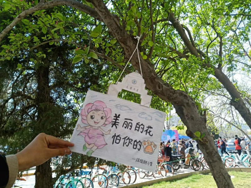 海棠节,财管手绘环保警示标语,提醒大家赏花时更应爱花;在校园内引导文明出游,组织校内唯一一个引导站,为游客与校友们提供帮助,展现天大学子风采,并登上天大官微。