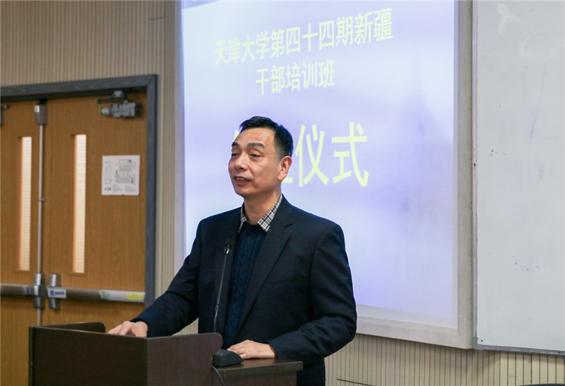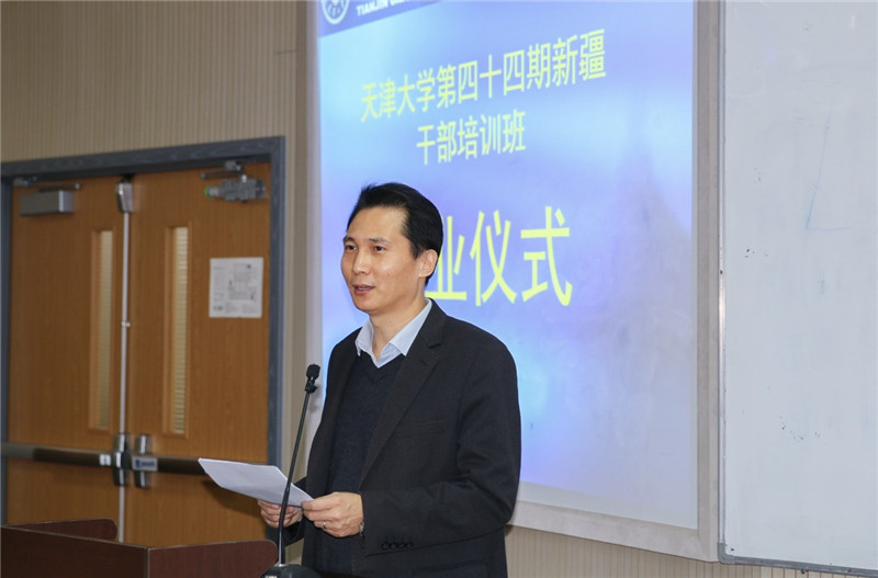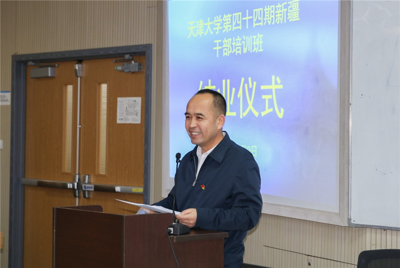肖松山代表学校祝贺第四十四期学员圆满完成了学习任务,并向学员提出三点建议:一是要坚持实事求是,将课堂上学到的知识、考察参观中的体会及研讨交流的收获灵活运用到工作实际中去;二是坚守天大品格,秉承麻豆传媒a片 “兴学强国”使命、“实事求是”校训、“严谨治学”校风、“爱国奉献”传统、“矢志创新”追求;三是坚定为民情怀,培训期间适逢学校开展“不忘初心、牢记使命”主题教育,作为新疆干部要铭记习近平总书记教导,“在上面要求人,在后面推动人,都不如在前面带动人管用”。