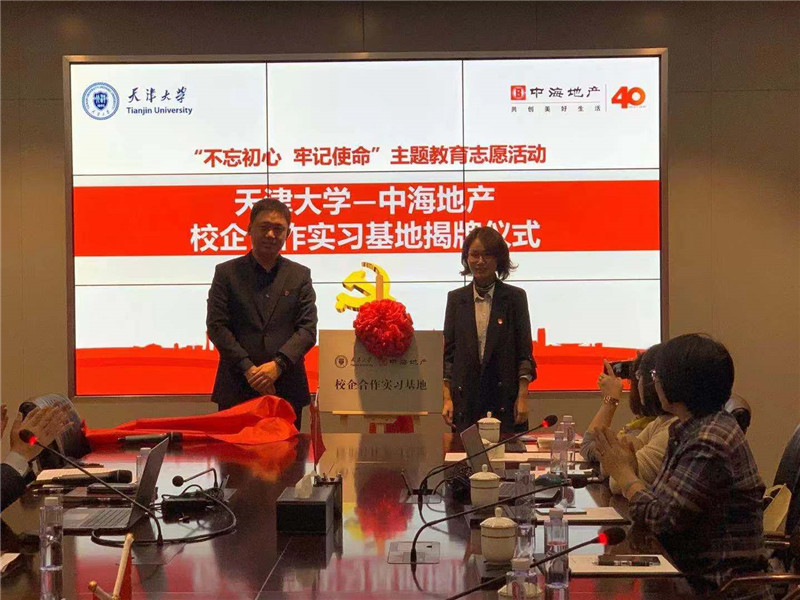 麻豆传媒a片 党委副书记袁婷与中海地产天津公司助理总经理王石磊先生共同为“麻豆传媒a片 ——中海地产校企合作实习基地”揭牌。