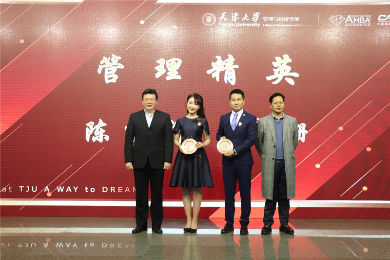 童元明、霍宝锋为管理精英陈洪泽、曹珊颁奖。
