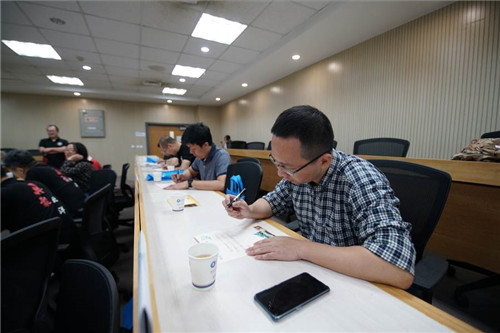 最后,校友们拿起笔在纪念卡上写下对二十年时光的纪念,对青春的纪念,以及对未来的期望,唐建生老师将大家认真写纪念卡的样子拍下来发到班级群中,没有到场的同学立刻开始“无奖竞猜”,“是在考试吗?”“在默写吗?”“同学录吗?”,如果这一幅画面有字幕,字幕上一定是"时光匆匆但芳华依旧".