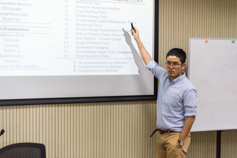 Wataru Nozawa助理教授在会上做了题为“董事会构成,公司环保策略和财务绩效”的报告。报告内容主要围绕两个基本问题展开:一是“什么样的公司在环保策略方面更为严格?”;二是“公司的环保策略会损害财务绩效吗?”。为了回答上述问题,Nozawa利用彭博社收集的全球5712家公司数据展开实证分析。首先,他跟据董事会构成状况,对公司进行了基本分类;其次,利用收集到的财务数据测算了各公司的财务绩效水平;最后,依据公司环保策略的披露与执行情况,对环保策略也进行了分类。在此基础上,利用潜在类别分析法,考察各类别变量之间的相互关系。该研究为公司完善董事会结构,选择适当的环保策略,进而增强财务绩效提供了一定的启示。