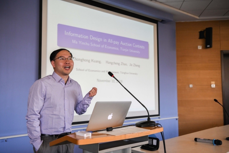 复旦大学经济学院院长助理王弟海教授主持了“产业经济学与发展经济学理论”专题研讨环节。美国圣路易斯华盛顿大学博士、清华大学经济管理学院副教授郑捷围绕全支付拍卖型竞赛中的信息设计这一主题,提出了自己的一些看法。郑捷认为,相比传统的二元离散型信息披露政策,贝叶斯游说方式的随机信息披露政策更具有灵活性和一般性,理论上可以为设计者带来更高的收益水平。在对不完全信息下二人全支付拍卖型竞赛的均衡策略进行完全刻画的基础上,发现并证明了对设计者而言最优的信息结构。最优的信息结构可以通过两个相对简单的后验分布实现,最优信息设计下的总努力水平要显著高于传统的离散型信息披露政策下的总努力水平。“据我们了解,这是在无限行动空间的博弈环境里完全刻画最优信息结构的第一份工作。我们的结果也可以用于分析政府应该如何对某一行业内的有竞争关系的企业设定合理的信息披露政策。”郑捷如是说。