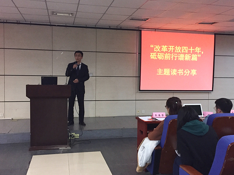 经管学部2018级硕士生的十个党支部代表分别围绕《构建共享型社会----中国社会体制改革40年》《读懂中国经济——大国拐点与转型路径》《构建开放型经济新体制----中国对外开放40年》《从计划到市场——中国计划投资体制改革40年》《大国根基----中国农村改革40年》《大国大金融——中国金融体制改革40年》《中国改革历史、逻辑和未来》《伟大的中国工业革命》《筑牢文化自信之基----中国文化体制改革40年》《回荡的钟摆》十本书籍为大家带来了精彩的读书心得分享。其中来自第二党支部的刘明静同志对于改革开放时期中国经济政策的变化以及变化原因进行了深入介绍;第八支部的刘楠林同志则在分享中对比了中国工业革命与外国工业革命的异同;第十支部的权佩芸同志用动态的PPT效果将“回档的钟摆”诠释的淋漓尽致;第七支部的冯文泽同志在介绍书籍内容的同时,更是着重介绍了支部读书活动开展情况,从“一句话短评”到集中分享,党员、入党申请人、团员的全体学习是对改革开放的敬意。