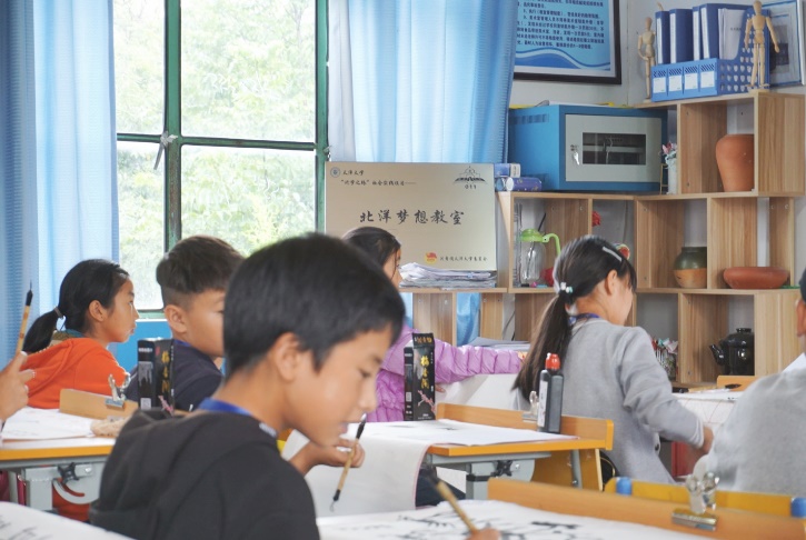 当日上午,与音乐课一同进行的课程还有源胜小学爱心屋内的中国古代机关术课程及起凤小学美术教室内的国画课程。两门课程都由实践队队员开设,旨在让孩子们学会利用好已经建成的梦想教室,用现有的资源为自己开拓视野,学习新知。课程结束后,两个教室都进行了梦想教室挂牌仪式。