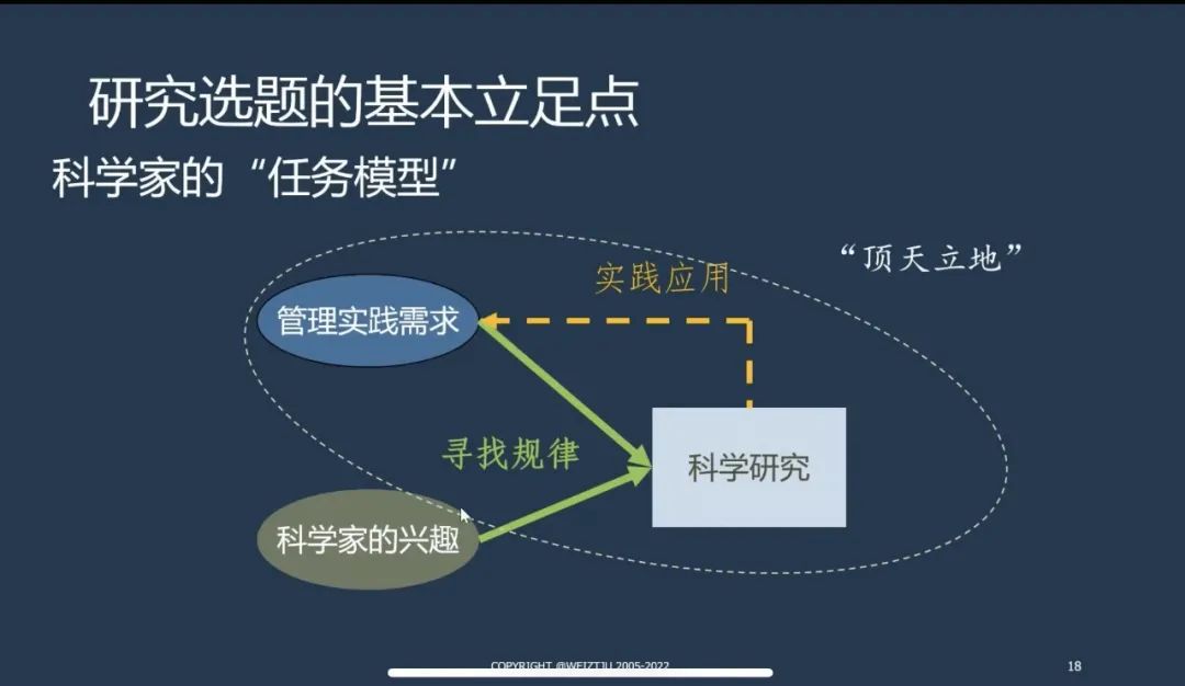 随后,他详细介绍了研究选题的基本立足点。他提出,科学研究依赖于“两个轮子”,分别为实践需求、科学家的好奇心。管理科学的发展更多地依赖于“实践需求”这只轮子。我们要从管理实践需求出发,发现管理科学问题;通过对这些问题的科学研究,获得管理新知,进而支持管理实践。