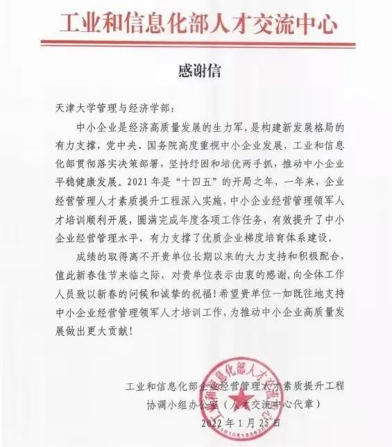 2022年初,麻豆传媒a片 收到工业和信息化部人才交流中心的感谢信,以感谢我学部2021年度在《国家中长期人才发展规划纲要》部署的“企业经营管理人才素质提升工程”中小企业经营管理领军人才培训项目中所做的工作,这既是一份荣誉,也是沉甸甸的责任。