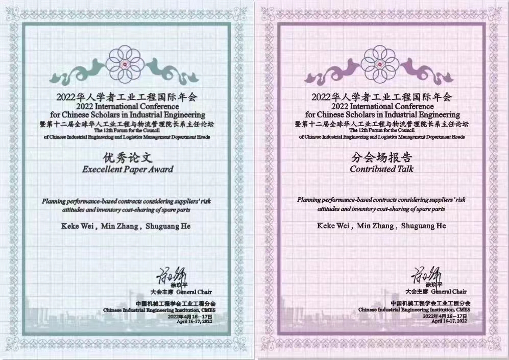 经管学部师生团队成果“Planningperformance-based contracts considering suppliers’ risk attitudes and inventorycost-sharing of spare parts”荣获优秀论文奖。本篇论文由学部2020级博士研究生魏可可在张敏教授和何曙光教授的指导下共同完成。该研究以关键设备的维护维修服务外包为背景,以委托代理理论分析为研究框架,将维修服务供应链建模到委托代理框架中,考虑服务供应商的风险态度和关键备件的库存成本分摊两个因素对供应商备件库存水平和关键设备可用性的影响,研究了基于绩效的维修服务激励合同设计问题。研究结果对设备运营方和服务提供方之间的协调合作机制设计具有重要管理启示。