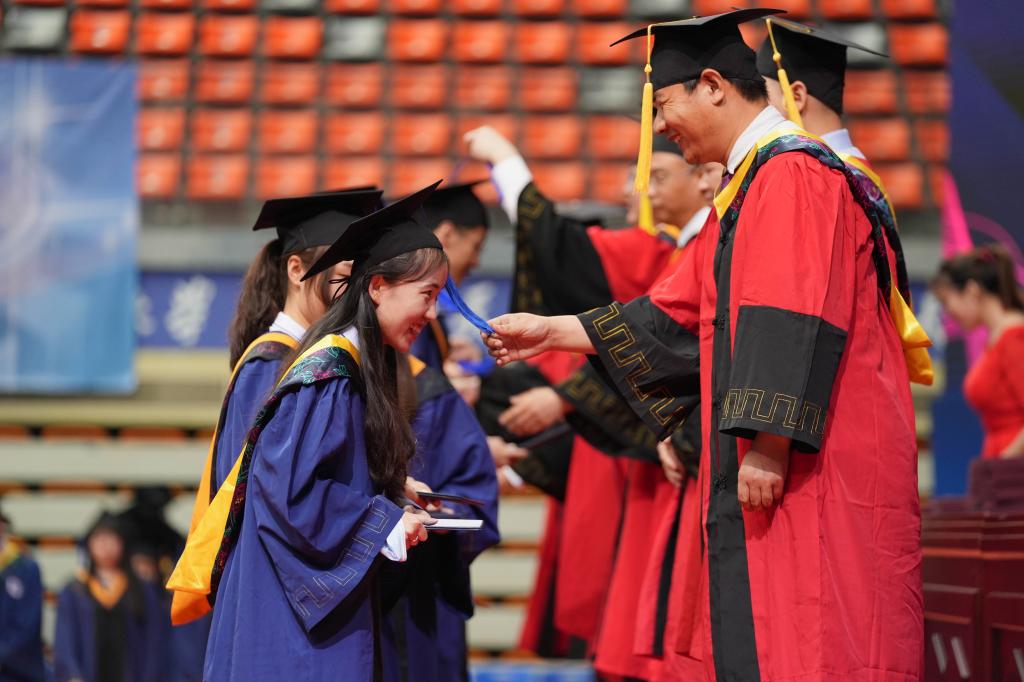 学部领导及各系所教师代表依次上台为毕业生拨穗正冠,让毕业生与校园生活进行满含“仪式感”的告别,为学生们勾勒最后一笔美好。