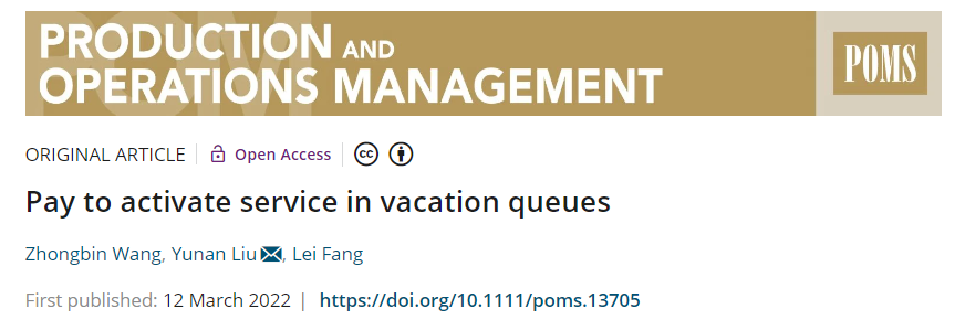 近日,经管学部王钟彬副教授作为第一作者的文章Pay to Activate Service in Vacation Queues在国际管理科学与运筹学顶级期刊Production and Operations Management(UTD-24种商学院顶级期刊)上正式发表。