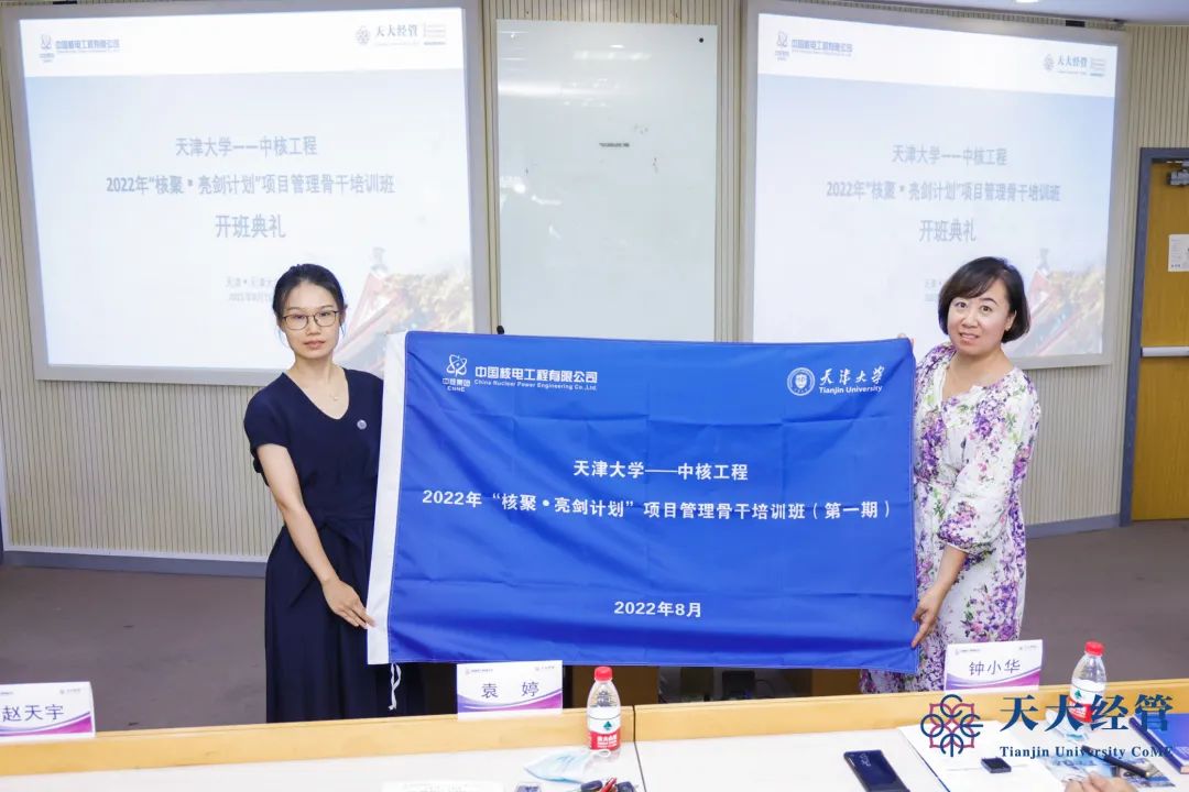 随后,学部党委副书记袁婷与中核工程项目管理部综合管理科科长赵天宇进行了班旗授予仪式。