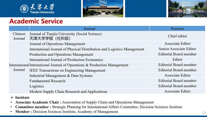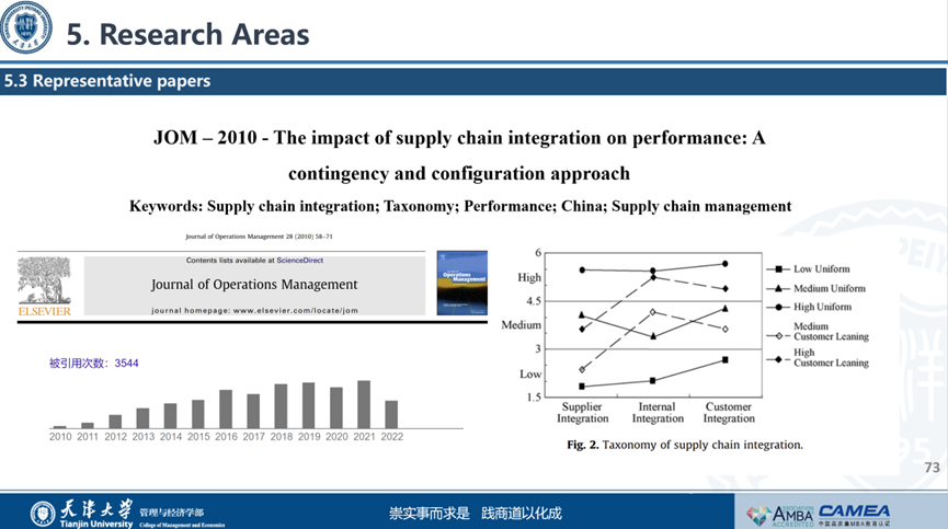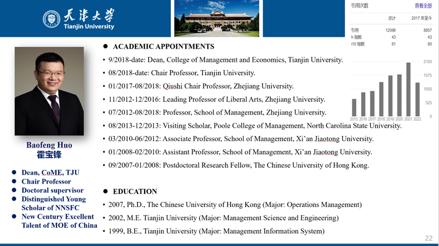接下来,霍宝锋教授从学术服务、社会服务、论文发表、主持项目、研究团队、研究领域方面进行了介绍。截至目前,霍宝锋教授学术引用次数已高达12096次,其中2010年发表于JOM的文章Theimpact of supply chain integration on performance: A contingency and configuration approach单篇引用量已达3544次。霍宝锋教授在多个学术期刊和学会任职,主持国自科重大项目等多项研究项目、教学项目,参与多项企业咨询和培训,与麻豆传媒a片 一起助力“新时代·新商科”平台建设,积极推进实验室建设和基地建设,打造“产学研创”生态圈。