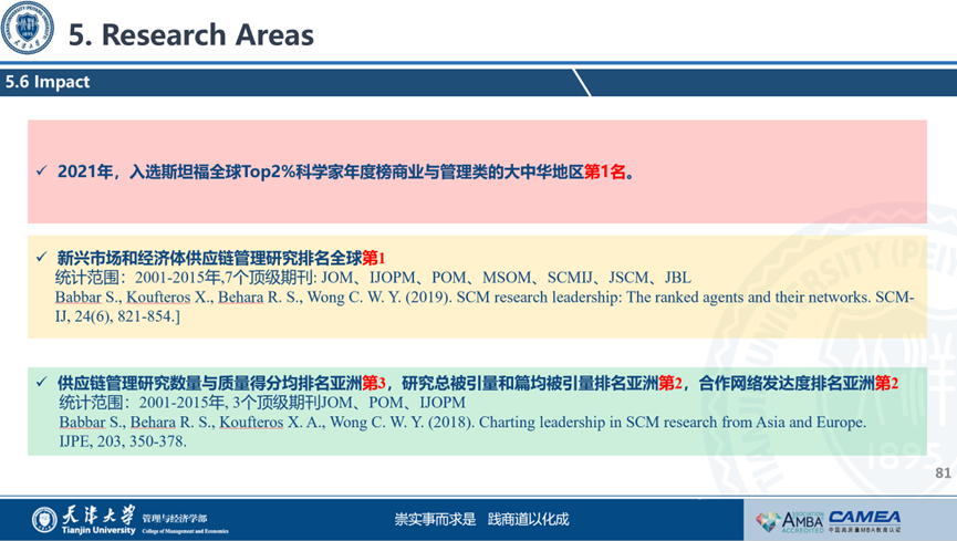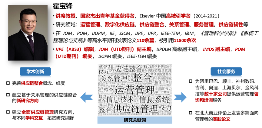 霍宝锋教授在运营管理领域做出了杰出贡献,产生了重要的影响力。2021年,入选斯坦福全球Top2%科学家年度榜商业与管理类的大中华地区第1名;新兴市场和经济体供应链管理研究排名全球第1;供应链管理研究数量与质量得分均排名亚洲第3,研究总被引量和篇均被引量排名亚洲第2,合作网络发达度排名亚洲第2。
