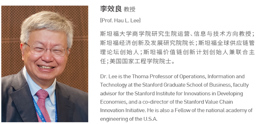 HauL. Lee(李效良)教授,美国国家工程院院士,斯坦福大学商学院运营、信息与技术讲座教授、斯坦福全球供应链管理论坛创始人、斯坦福经济创新及发展研究院院长。HauL. Lee教授长期专攻于供应链管理、信息技术、全球物流、系统设计、库存计划和制造型企业战略规划等领域,是需求链理念、牛鞭效应(Bullwhip effect)及3A供应链理论(Triple A supply chain: agility, adaptability, alignment)的首创者。