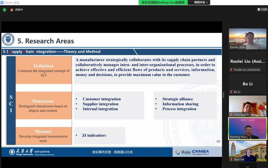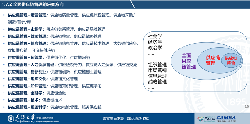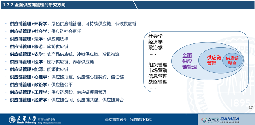 最后,霍宝锋教授向与会者详细分享了他的研究领域。首先是供应链整合的理论与方法,其次是供应链整合的前因与结果,并进行一些相关领域的代表性文章介绍,再次是3PL管理的讲解,最后是全面供应链“供应链+”的相关研究与影响力。全面供应链管理指企业以供应链为核心,从政治、经济、文化等全方位视角,全面满足供应链所有利益相关方需求的活动体系。全面供应链管理的基本思想是“供应链+”,也就是跨学科、跨领域、跨层次的供应链管理。