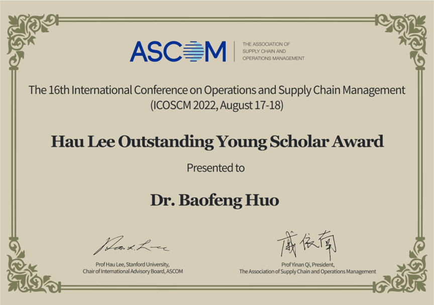 本站讯(通讯员 宇文慧)8月18日上午,国际供应链与运营管理学会(Association of Supply Chain and Operations Management, ASCOM)组织了2022第十六届运营与供应链管理国际会议(The 16 thInternational Conference on Operations and Supply Chain Management, ICOSCM 2022)的颁奖环节,霍宝锋教授获得第一届Hau Lee Outstanding Young Scholar Award。ASCOM前主席、武汉大学经济管理学院刘学元教授为获奖人颁发证书。