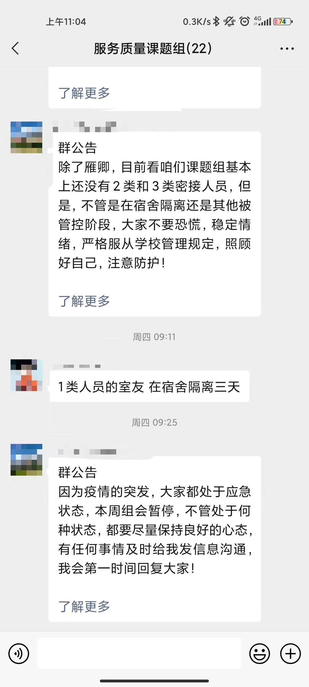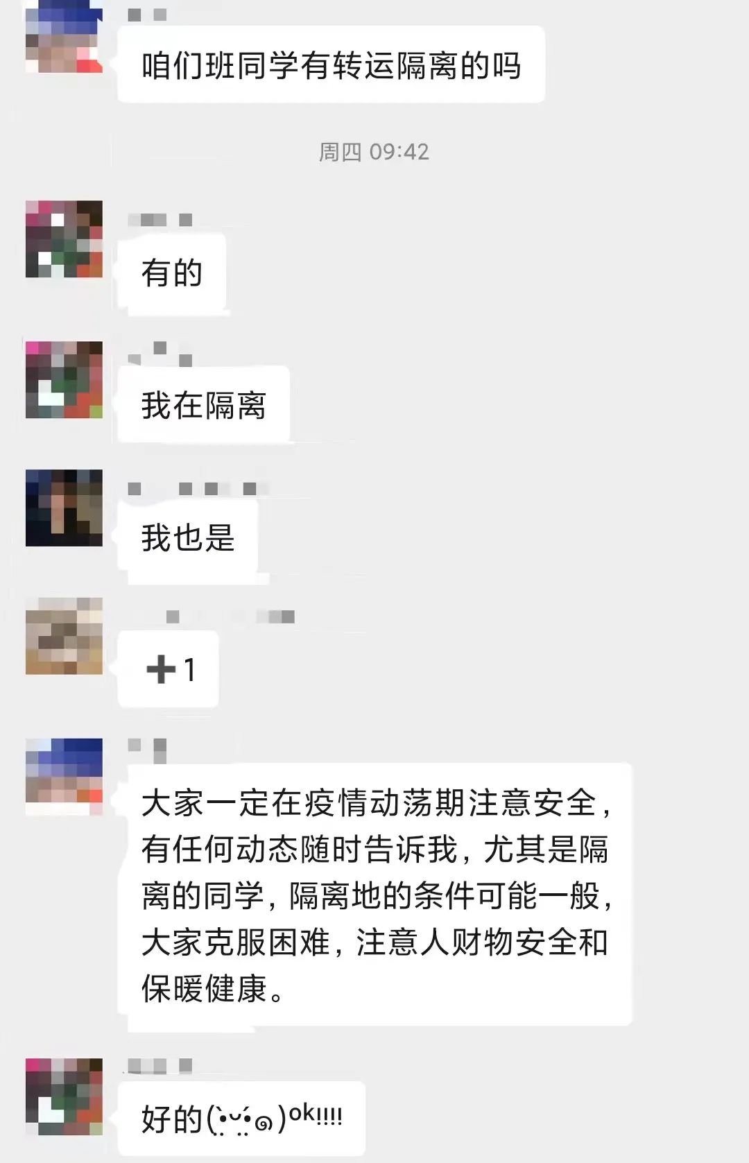 部分需校外集中隔离同学被转运至宁河、武清、津南等隔离点。辅导员做好学生的“快递员”“送站员”“后勤保障员”,第一时间建立微信群,做好人员统计、需求汇总、志愿者协调等工作,一方面组织协调转运学生,及时反馈大家遇到的生活困难;另一方面化身“楼长”,关照着校内静默的学生,第一时间安排好核酸检测,保障学生一日三餐正常供应。