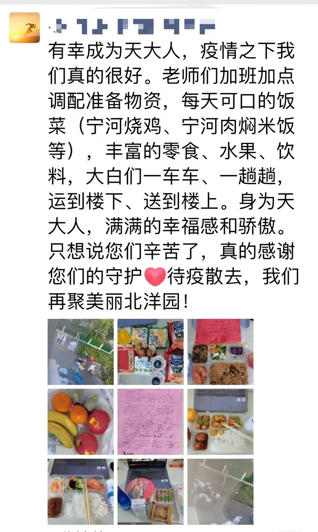 一位硕士生提到,“隔离期间,生活难得如此规律,跟室友发消息还说到‘这可比我在学校的生活规律多了,一日三餐从来没这么准时过,平常懒得搭配的肉蛋奶,这回也有人帮忙搭配好了送过来。’静下心来,我对过去一年的支教生活做了个复盘总结,也对我即将开始的研究生生活做了个规划。希望隔离结束之日,能够以更加蓬勃的面貌重返校园。”
