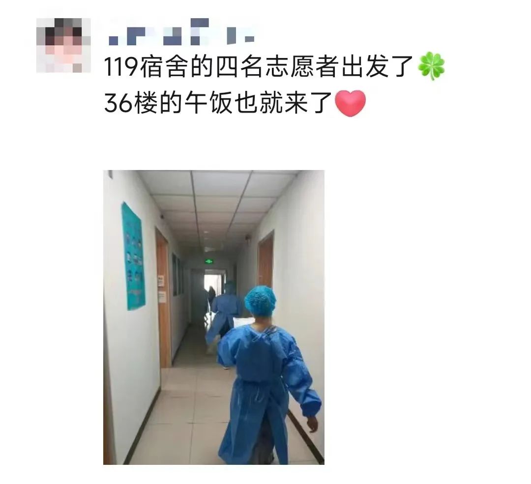 博士生李楠就是其中活跃的一份子,她说:“不久前,我因为腰部受伤,卧床休息了一个月,老师同学们都经常帮我送饭,医务人员也上门帮我做核酸,这次为29斋的同学们送饭,也是我回馈大家的一种方式。疫情就是命令,防控就是责任,作为入党积极分子和班委,这也是我应尽的一份义务,疫情不退,我们不退。”