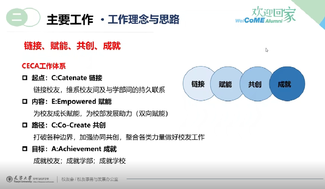 李文强做校友工作介绍。他指出,“链接、赋能、共创、成就”是校友办公室一以贯之的工作理念。为加强校友与母校之间的情感沟通,校友办公室特别设立校友联络员职位,同时开设“天大经管校友之家”公众号,定期向校友发送生日祝福卡、发贺卡贺信,做好情感链接,整合学部内外各类资源,共同推进校友工作,助力学部发展。