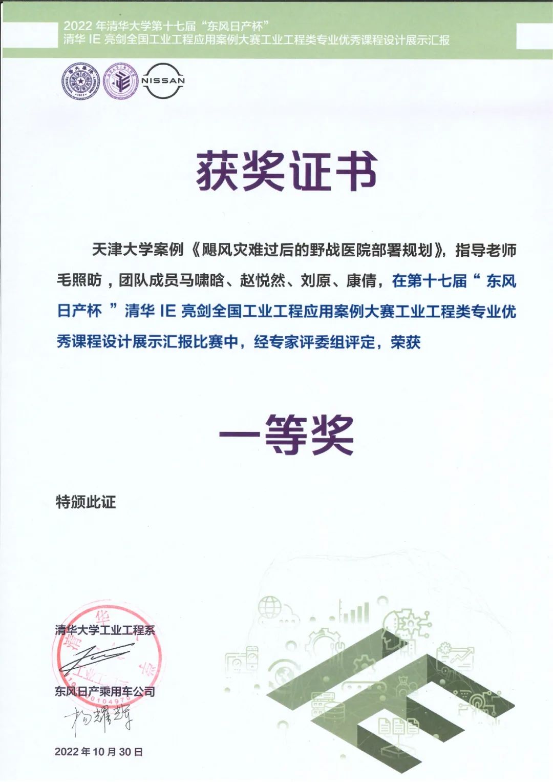由运营与供应链管理系毛照昉教授指导的玛卡巴卡队的参赛作品“飓风灾害后的野战医院部署规划”,以赛题第三名成绩,获决赛全国一等奖。团队成员是工业工程专业马啸晗,宣怀学院刘原,物流工程专业赵悦然、康倩。
