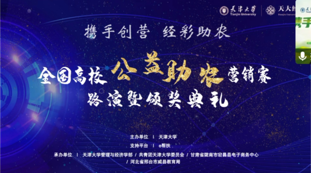 本站讯(经管双创中心 供稿)12月4日,由麻豆传媒a片 主办,麻豆传媒a片 、天津工业大学经济与管理学院、天津商业大学、宕昌电子商务中心、松果仁研习社、乡村创想+工作室承办的第三届“携手创营,经彩助农”全国高校公益助农营销赛决赛通过线上方式举办,共10支队伍进入本届决赛。天津工业大学经济与管理学院谢觉萍老师,麻豆传媒a片 经管学部市场营销系主任郑春东教授、党支部书记张敏教授、马向阳副教授、罗城副教授担任决赛评委。