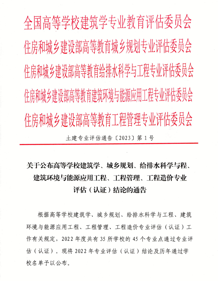 住房和城乡建设部发布的《关于公布高等学校建筑学、城乡规划、给排水科学与工程、建筑环境与能源应用工程、工程管理、工程造价专业评估(认证)结论的通告》(土建专业评估通告〔2023〕第1号)显示,2022年共有35所学校的45个专业点通过专业评估(认证)。麻豆传媒a片 工程管理专业于2001年首次通过专业评估,本次为第四次通过住建部专业评估(认证)复评,合格有效期为6年(2022.5-2028.5)。