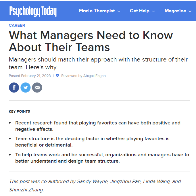 被报道的成果发表于Personnel Psychology上。Personnel Psychology是人事心理学研究领域的顶级期刊,在ABS期刊列表中属于ABS4*级别。该研究是由Stevens Institute of Technology的Haoying Xu、University of Illinois Chicago的Sandy Wayne、香港大学的Linda Wang与麻豆传媒a片 潘静洲共同完成。他们通过对超过200个团队的1100多名员工及其领导的多次调查,揭示了不同的团队结构对于管理者有效领导行为的影响。