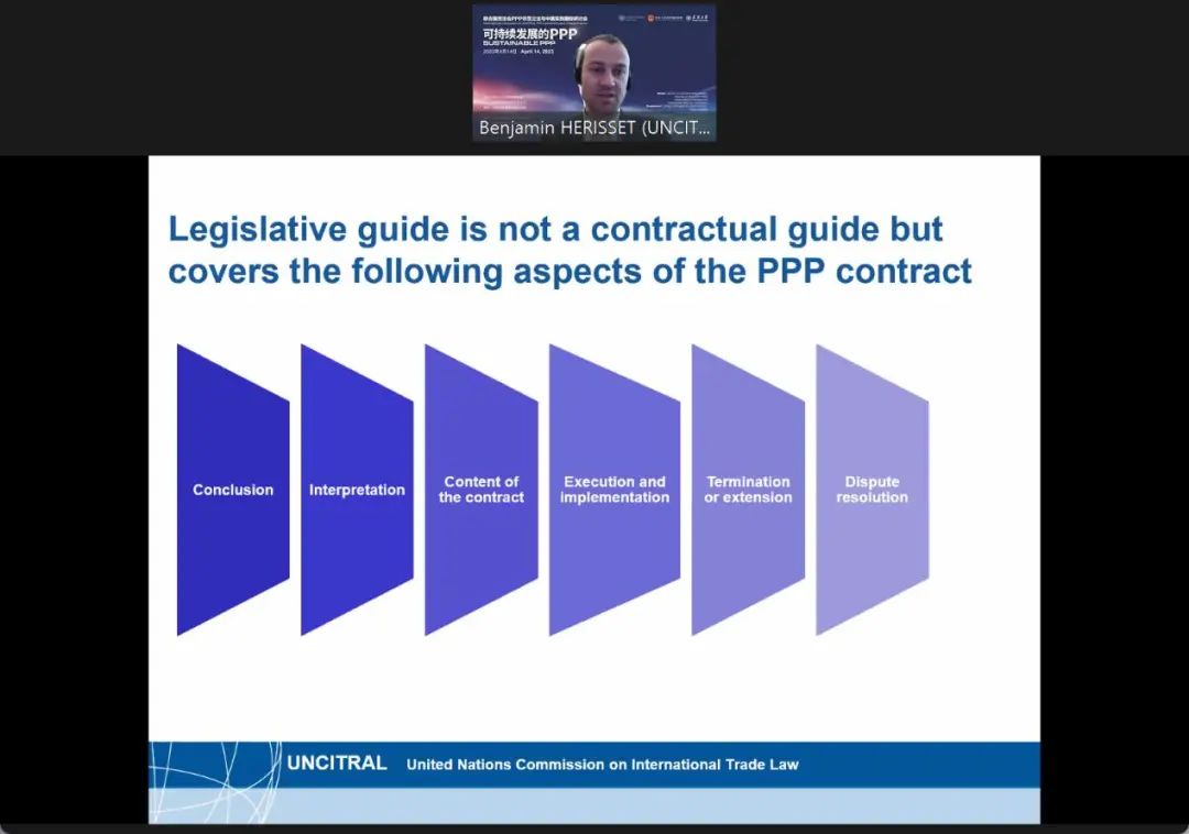 叶军副司长指出,中国已经迈上全面建设社会主义现代化国家的新征程,PPP模式在吸引和撬动社会投资、促进低碳与可持续发展等方面发挥了重要作用。联合国贸法会在PPP领域形成的《立法指南》和《示范立法条文》等系列法律文书将对各国PPP立法产生深远影响。为推动PPP模式健康发展,中国不断探索完善相关立法和管理制度。相信在商务部与联合国贸法会的密切合作下,借助中国PPP改革创新经验和良好实践,将进一步引导、推进和深化全球PPP模式的可持续发展。