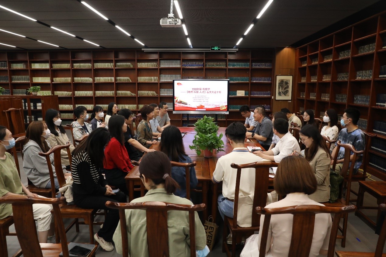 本站讯(通讯员:李莹 摄影:唐宇涵)为持续深化学习贯彻习近平新时代中国特色社会主义思想主题教育,创新学习教育载体,发挥联学共建互融互促作用,2023年5月19日下午,图书馆文化与技术党支部同经管学部信息管理与管理科学系党支部、综合服务中心第二党支部以及2020级本科生第二党支部开展“‘教育、科技、人才’看天大这十年”主题教育联学共建活动。