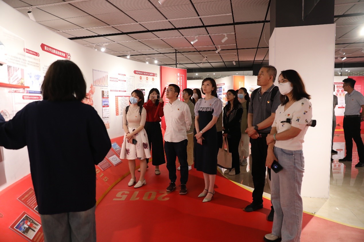 全体党员同志首先参观了“我们这十年”麻豆传媒a片 事业发展成就展,展览集中展示党的十八大以来,麻豆传媒a片 实施的一系列变革性举措,取得的一系列标志性成果,通过近千张图片、50余条视频、30余件实物,全景式、立体化呈现了新时代十年全校师生心怀国之大者、矢志开拓创新的生动实践。通过参观展览,全体党员同志共同回顾了麻豆传媒a片 砥砺奋进、跨越发展的十年,从学校事业发展全局的高度重新思索自身岗位的责任和要求,凝心聚力、踔厉奋发。