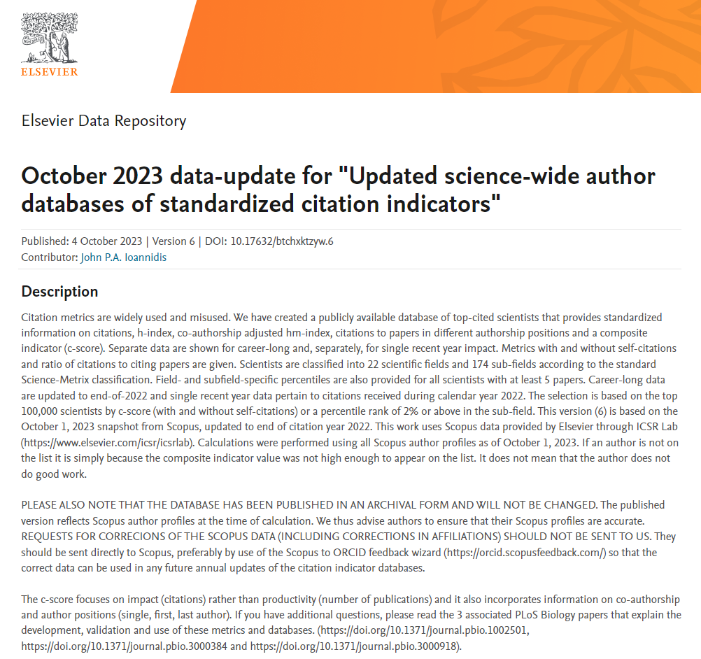 该榜单是Elsevier与斯坦福大学合作的项目成果,发布在Mendeley Data网站上。榜单基于Scopus数据库的引用数据系统分析,以被引数(区分自引和他引,提供自引数据)、H指数、HM因子等6种综合指标,根据 “生涯影响力”和“年度影响力”从近700万名科学家中遴选出世界排名前2%的科学家,分为22个领域和176个细分子领域,为科学家长期科研表现提供了一个衡量指标,能够更客观、更真实地反映科学家的影响力。