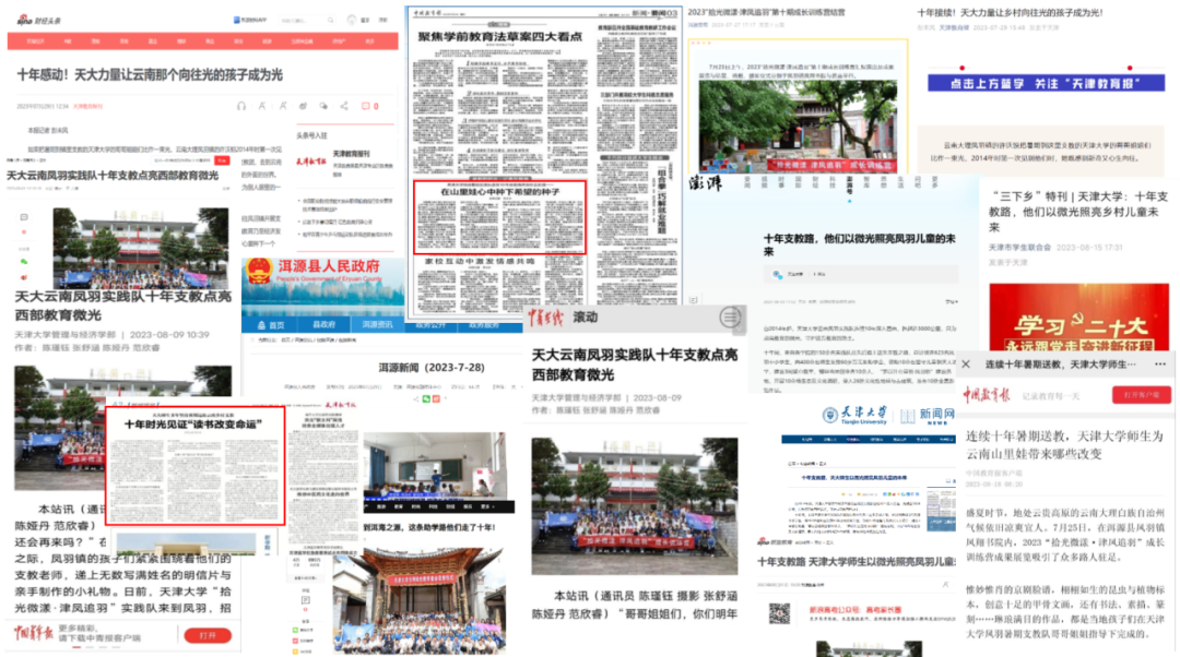 长达十年的坚守和付出,让“拾光微漾·津凤追羽”在众多团队中脱颖而出,得到了洱源县委、洱源县人民政府、凤羽镇党委、凤羽镇人民政府和校团委的高度重视,被新华网、中国青年报、中国教育报、中青校园、津云、天津教育报、天津市学生联合会、大理日报、洱源县人民政府官方网站等20余家知名媒体报道。