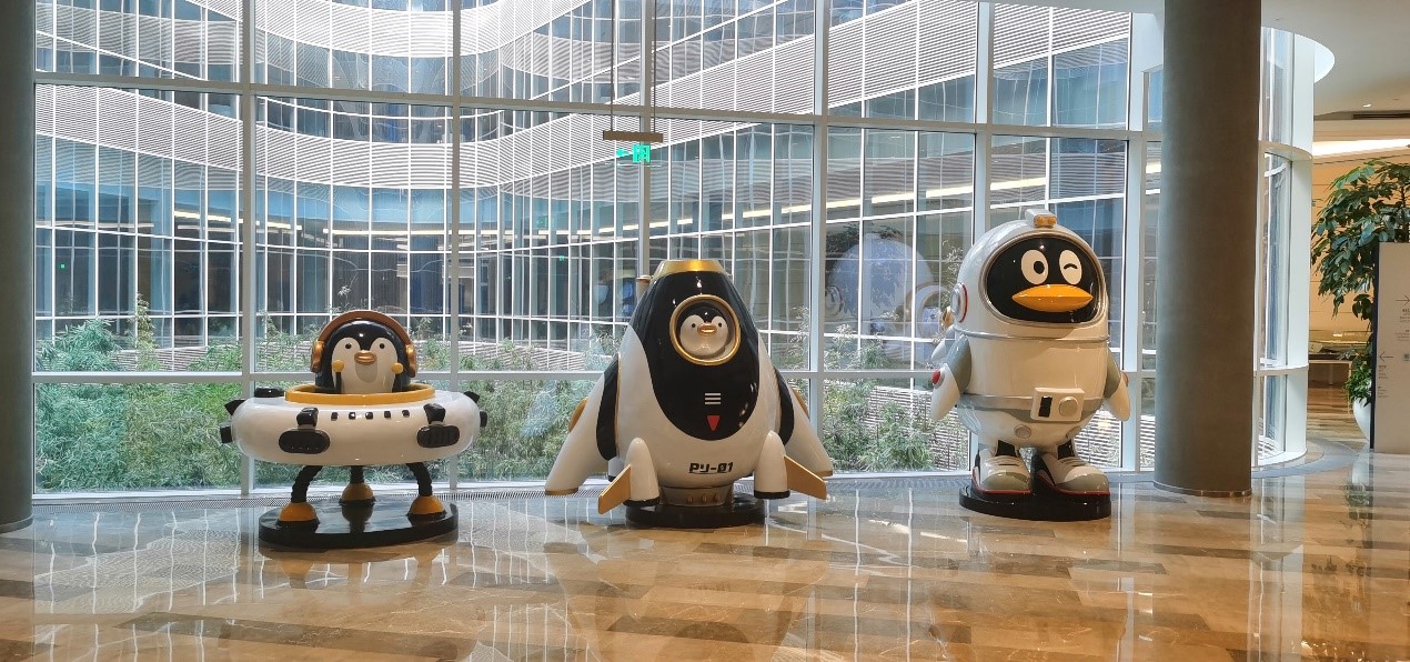 大楼整体空间极具设计感,一步一景,恢弘大气,公司随处可见的企鹅元素让人倍感亲切。跟随着讲解员的脚步,师生步入了腾讯科技展厅。