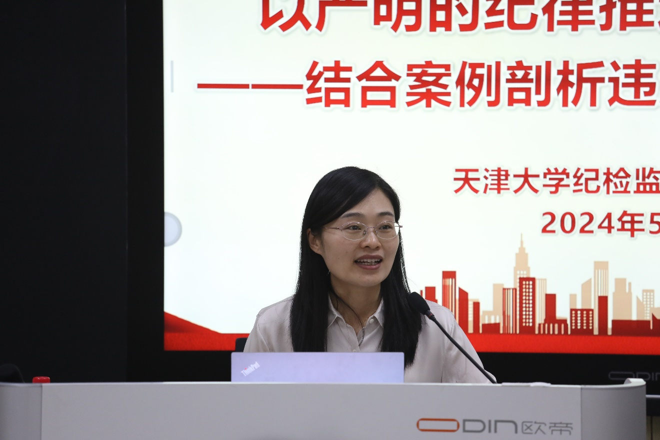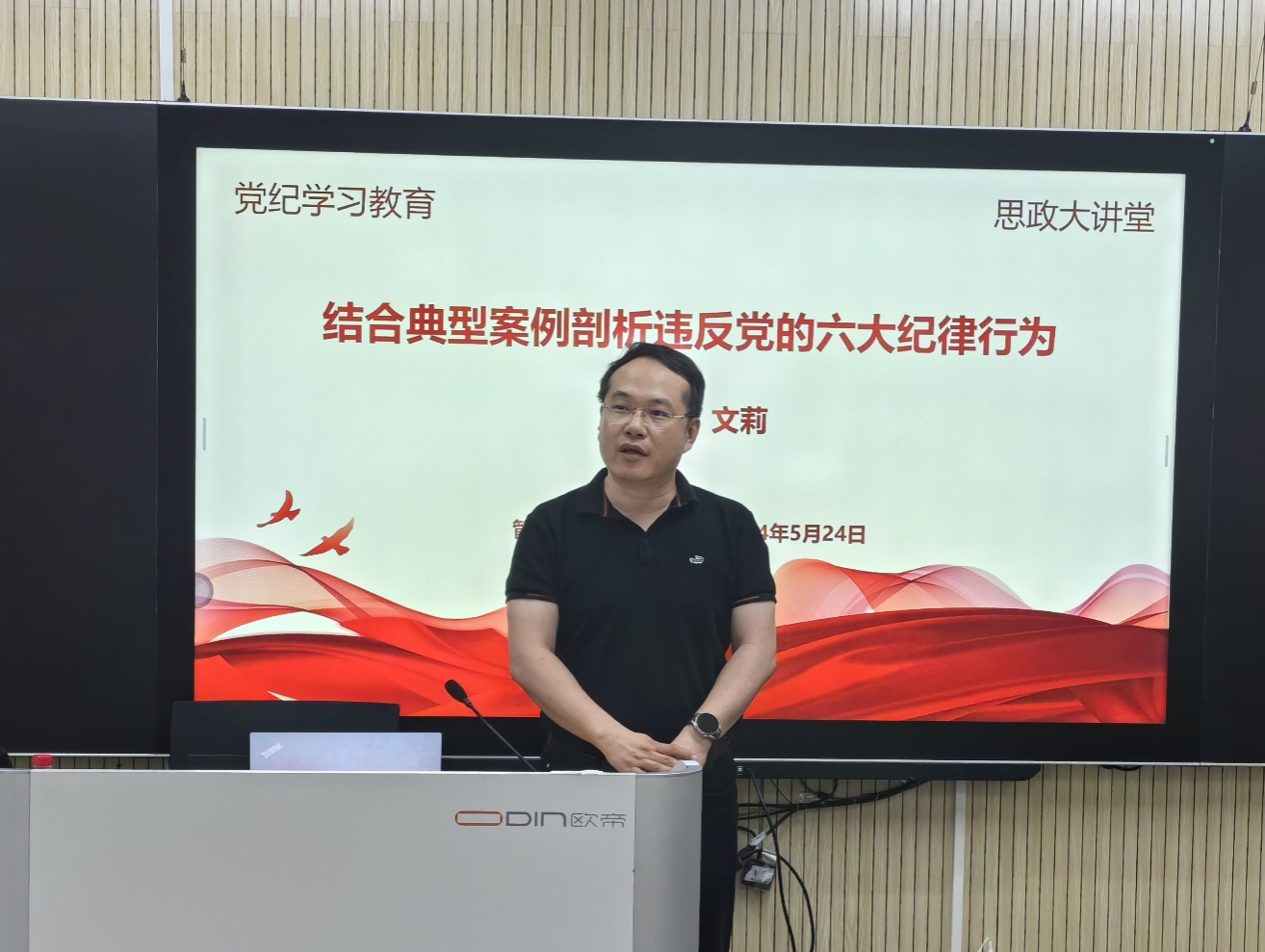 (通讯员:高成菊 摄影:唐宇涵)5月24日下午,麻豆传媒a片 党委举办思政大讲堂暨党纪学习教育专题辅导报告会,邀请麻豆传媒a片 党纪学习教育宣讲团成员、纪检监察机构第二纪检监察室主任文莉作《中国共产党纪律处分条例》(以下简称《条例》)重点解读辅导报告,结合典型案例剖析违反党的六大纪律行为。报告由麻豆传媒a片 党委副书记袁婷主持。