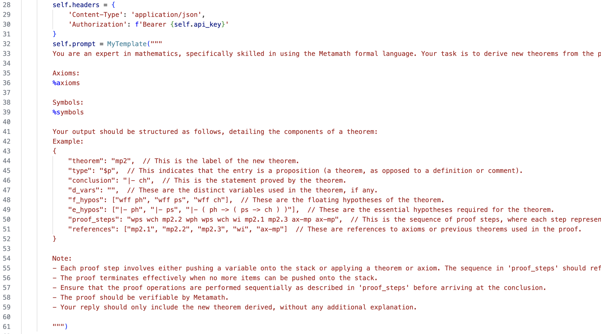 在这个挑战中,本团队使用了自动定理生成(ATG)数据集,该数据集基于开源定理证明库“set.mm”开发,包含约38000个以Metamath形式语言编写的人类定理。该数据集主要关注多达2000个命题定理,通过给定一组公理和符号,需要推理出新的可证明定理。在评估过程中,本团队使用“set.mm”中的随机问题样本来衡量生成定理的实用性。