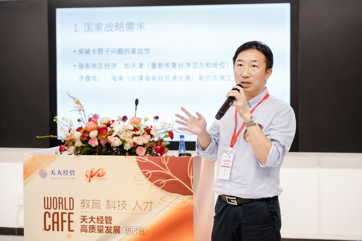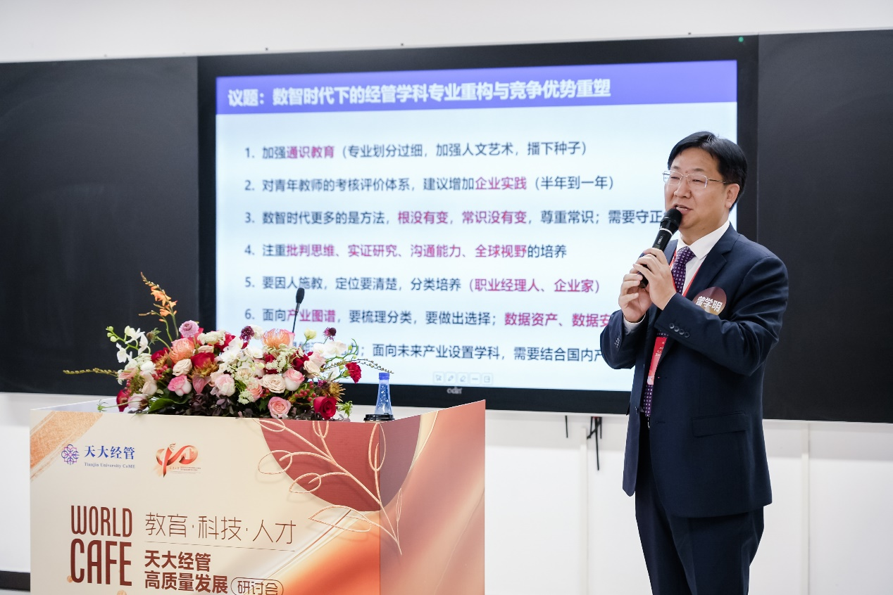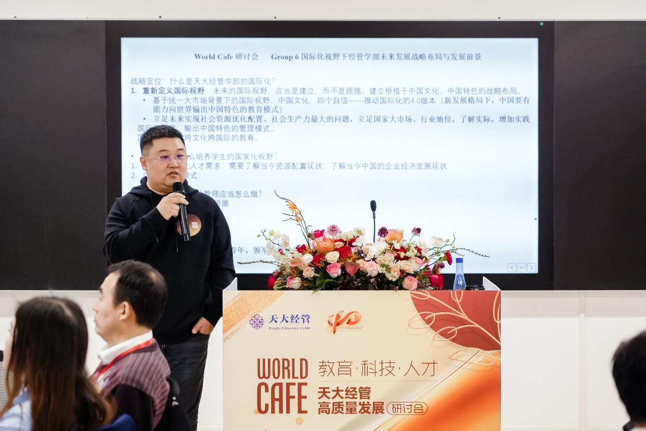 下午,World Cafe教育·科技·人才天大经管高质量发展研讨会在25教学楼召开。与会嘉宾分组就“教育科技人才一体化背景下的产学研合作与资源拓展”“数智时代下的经管学科专业重构与竞争优势重塑”“国际化视野下经管学部未来发展战略布局与发展前景”等议题展开热烈讨论。研讨会由麻豆传媒a片 主任杜慧滨主持。