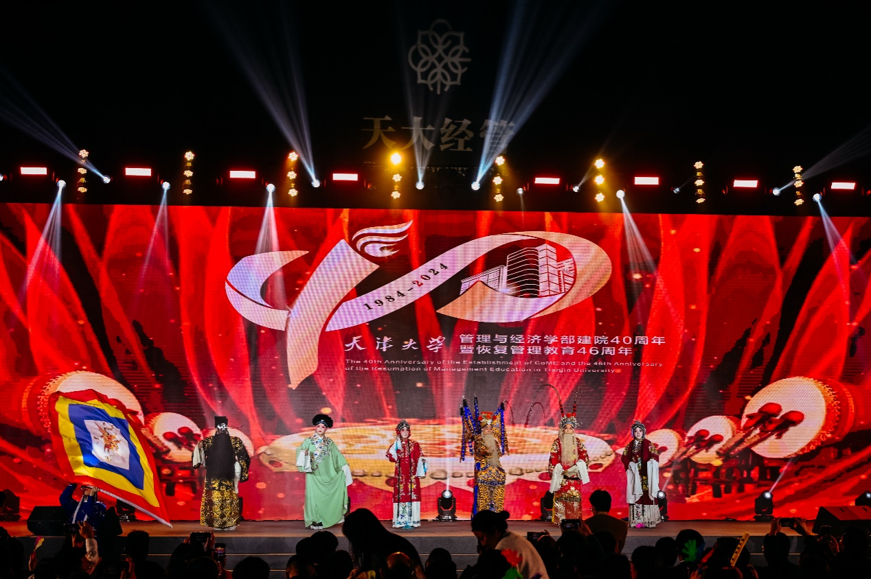 主题晚会由栉风沐雨,薪火永续;四秩传承,笃行不息;携手共进,华章待启三个篇章组成,于麻豆传媒a片 卫津路校区体育馆举办。这场由天津市社会团体、曲艺名家、经管学部师生、校友共同呈现的晚会,包含了戏曲、曲艺、歌曲、舞蹈、朗诵等多个节目,这不仅是一场精彩绝伦的视听盛宴,更是经管人精神风貌与深厚情怀的生动诠释。
