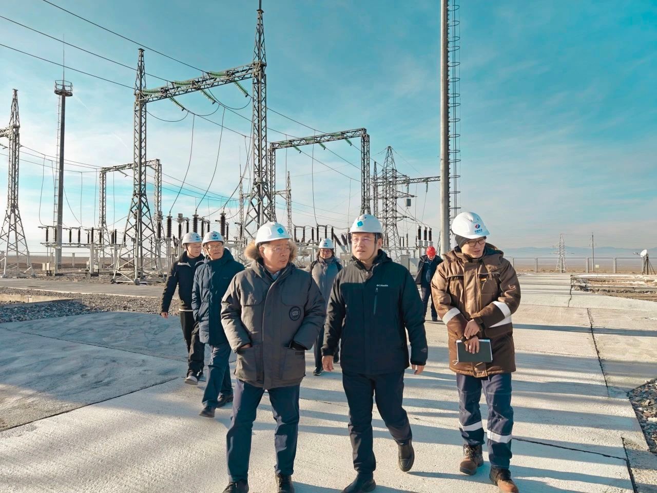 12月18日,代表团前往金风国际(哈萨克斯坦)Shelek风电项目实地调研。Shelek风电场由中国电建集团与哈萨克斯坦Samruk Energy公司共同投资建设,金风科技提供风机设备供货和技术服务。在电建海投项目经理王海峰、金风国际服务经理高江文的陪同下,代表团参观了项目的中控室、风电机组和升压站。