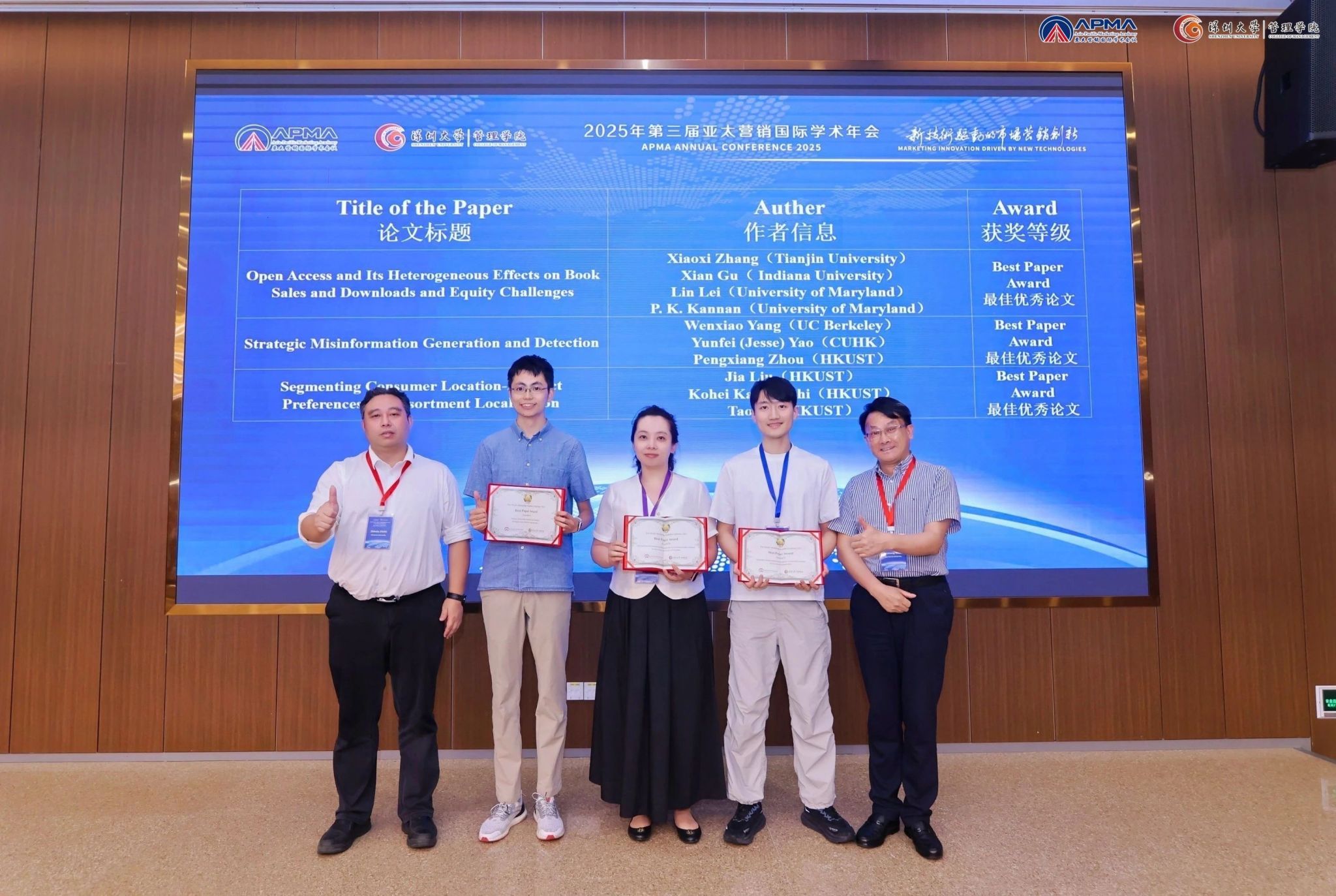 5月24日至25日,第三届亚太营销国际学术年会(APMA)在深圳大学召开。本届会议以“新技术驱动的市场营销创新”为主题,吸引了来自中国、新加坡、澳大利亚等20余个国家和地区的400余名学者参会,围绕数字营销、人工智能应用等前沿议题,通过30余场专题论坛展开深度研讨。麻豆传媒a片 经管学部市场营销系师生团队以1项会议最佳论文奖及3项博士生论坛获奖论文的优异成绩,成为本届会议获奖数量最多的高校之一。